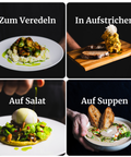 Wir sind 2 1/2 Köche aus der Sterneküche. Wir kennen die Tricks, mit denen Profi-Köche Gerichte auf ein anderes Level heben und wir wissen, dass die meisten davon super einfach sind. Unser Ziel? Diese Tricks zu dir nach Hause bringen. Ohne Aufwand, ohne Fach-Chinesisch, ohne dass du dein Leben umkrempeln musst. Kräuteröle sind die Öle, die wir selbst täglich verwenden, für schnelle Pasta nach der Arbeit, für Salate, für Suppen. Für alles, wo das gewisse Etwas fehlt.